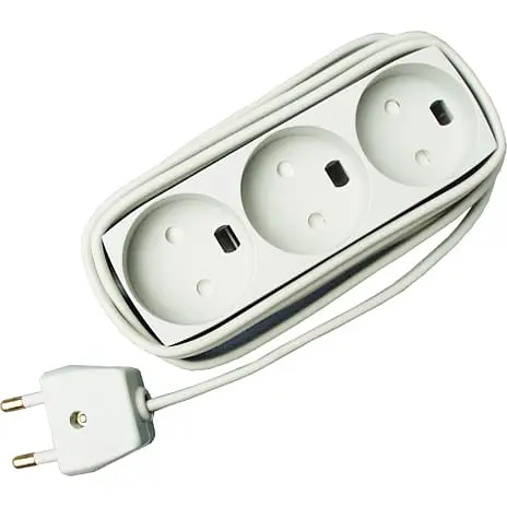 Hvid stikdåse T11 3 udtag, uden jord ,1,5 m ledning. Børnesikret, med blindhul og kun til indendørs brug. 10/250 volt.