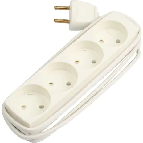 Hvid stikdåse T4 4 udtag uden jord 1,5 m ledning. Børnesikret og kun til indendørs brug. 10-250V.