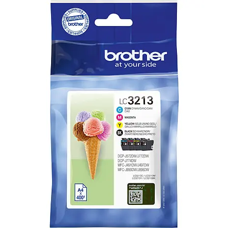 Original Brother LC3213VAL sampak med blækpatroner i sort, cyan, magenta og gul. Hver blækpatron giver op til 400 sider. (Jf. ISO/IEC24711)