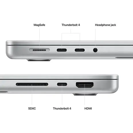 - Tre Thunderbolt 4-porte, HDMI-port, SDXC-kortplads, jackstik til hovedtelefoner, MagSafe-port til opladning