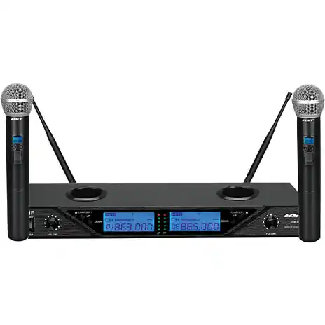 - Leveres med 2 håndholdte trådløs mikrofoner