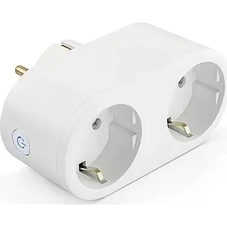 App-styret Smart Home plug fra Caliber med 2 udtag og energimåler. Fungerer med gratis “Caliber SMART HOME”-app. Har også fysisk on/off-knap samt