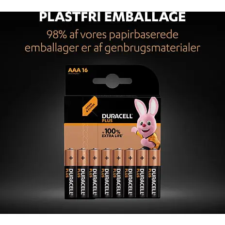 Duracell tilbyder et bredt udvalg af batterier til elektronik, som kræver pålidelig energi. Duracell Plus AAA batterier er alkaline batterier, som er ideelle til alle dine enheder. Duracell AAA alkaline har 100% garanteret levetid* (*kommerciel garanti vs. Minimum Gennemsnitsvarighed for alle 2015 IEC D-størrelsen. Resultaterne kan variere alt efter enhed eller brugsmønster (IEC’ hjemmeside)). Ubrugte Duracell batterier holder på energien i op til 10 år ved korrekt opbevaring. I 1969 var Duracell en del af Apollo 11-missionen og blev det første batteri på månen.