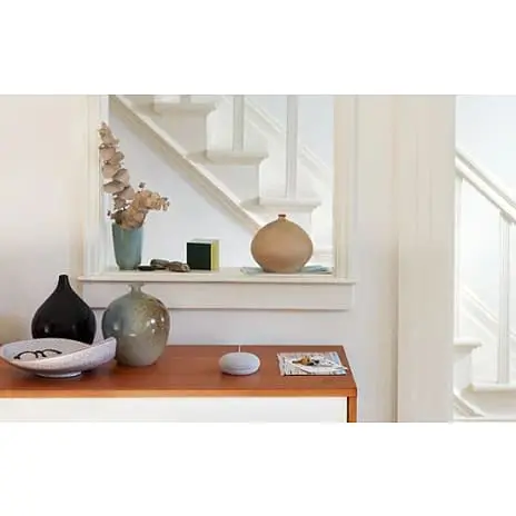 Nest Mini passer perfekt ind i dit hjem. Den gør sig godt på et natbord, en hylde eller på køkkenbordet – og også på væggen*. De minimalistiske og neutrale farver passer båd i entréen, stuen, soveværelset eller køkkenet.