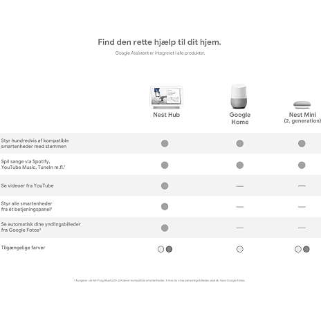 *Voice Match kraver yderligere konfiguration og tilmelding og understøtter op til seks brugere. Når du bruger Voice Match, skal du være opmærksom på, at en stemme, der minder om din, eller en optagelse af din stemme kan medføre, at Google forveksler en anden med dig. Det kræver en Google konto at bruge visse funktioner, f.eks. kalenderkommandoer.