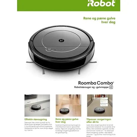| Tilbehør inkluderet | Roomba Combo™-robotstøvsuger og -gulvmoppe Home Base-ladestation 2 ekstra mikrofiberklude 2 ekstra filtre Ledning |