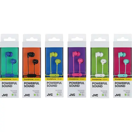 JVC høretelefoner – behagelige med sikkert siddende in-ear ørepuder, mikrofon og fjernbetjening.