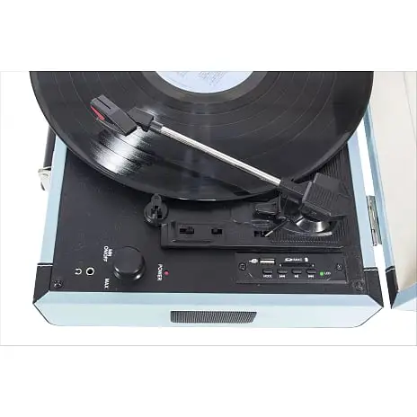 Partyklarpladespiller i retrokuffertdesign.Tag pladespillerenmed dig når du rejser.Indbyggede højttalere i pladespillerensikrer diggod lyd slev når du er ude.Afspil musik fra Bluetooth, USB ellerSD-kort.Optag dine LPer til USB og SD-kort, så du altid kan høre de dineLP’er.Udgang til hovedtelefoner.Afspilningshastighed 33/45/78 rpm.45 omdr./min adapter inkluderet.[return][return]