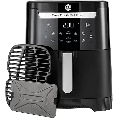 Med Easy Fry & Grill XXL kan du friturestege og grille samtidig med kun lidt eller ingen olie. Dermed kan du lave sund mad uden at gå på kompromis med den gode smag. Airfryeren har en kraftig blæser, der hurtigt cirkulerer ekstremt varm luft ved høj hastighed, og dermed friteres maden uden tilsætning af olie. Easy Fry & Grill XXL har en unik innovativ teknologi, der gør det muligt at bruge to forskellige programmer på samme tid – det giver perfekt friturestegte pommes frites og grillet kød. Du behøver ikke selv at tænke over tilberedningen – maskinen fortæller dig trin for trin, hvad du skal gøre og beregner automatisk tiden, så de to retter er klar på samme tid med perfekt resultat. Med den udtagelige rumdeler kan du nemt tilpasse madlavningsfladen. Du kan tilberede en hel kylling ved at bruge hele overfladen eller to forskellige retter samtidig ved at bruge den medfølgende adskiller. Med denne airfryer kan du tilberede en række forskellige retter ved hjælp af de otte automatiske programmer – en hel kylling, pommes frites, kød, fisk, friturestegt kylling, pizza, grøntsager og desserter. Den gør det også muligt at bage saftige chokolademuffins og brød og har desuden programmer til tørring og opvarmning. Den medfølgende støbte grillrist og den høje temperatur på 220 grader giver et perfekt grillet resultat. Derudover har grillristen non-stick belægning, som betyder, at der ikke er behov for fedtstof, og gør rengøringen meget lettere. En af de mange fordele ved denne airfryer er dens enkle brug. Fyld den aftagelige beholder med ingredienser, indstil temperaturen til 40-220 grader, og indstil timerfunktionen op til 60 minutter. Brug knappen Sync til at tilberede to retter samtidig. Den automatiske timer fortæller, når maden er færdig, eller når der skal røres i den. Et tydeligt digitalt LED-panel gør indstillingen meget enkel. Du sparer tid med denne varmluftsteknologi, fordi maden tilberedes dobbelt så hurtig som i en almindelig ovn, og maskinen er nem at rengøre. Alle løse dele tåler opvaskemaskine. Denne airfryer har XXL-kapacitet, hvilket betyder, at det er muligt at tilberede op til otte portioner (6,5 l). Dermed passer den godt både til en stor familie eller middag med mange venner. Opskrifter til inspiration findes på www.obhnordica.dk. Spar op til 65% energi med varmluftsfriturer fra OBH Nordica sammenlignet med en traditionel ovn, energiklasse A. Test udført i 2022 med frosne pommes frites.