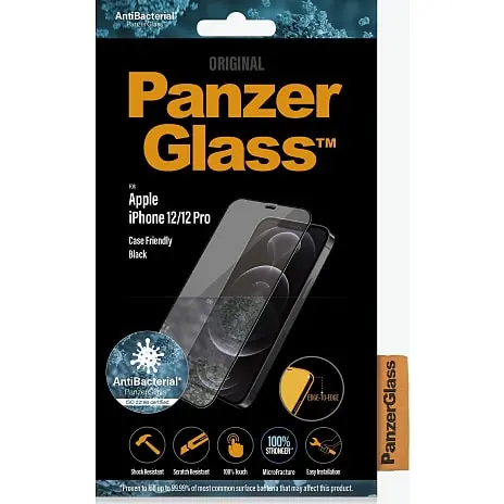 PanzerGlass™ skærmbeskyttelse til iPhone 12/12 Pro i sort med antibakteriel effekt, har de samme features som originalt PanzerGlass ™ og vil beskytte din skærm mod ridser og stød.