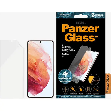 PanzerGlass™ til Samsung Galaxy S21 beskytter hele skærmens overflade mod ridser.