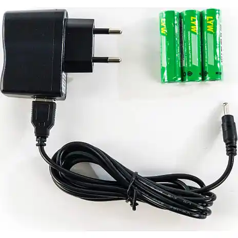 - Kan køre på batteri (AA) eller strømforsyning – begge inkluderet.
