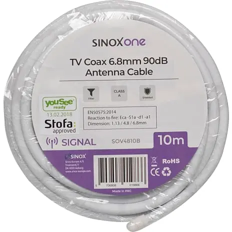 Sinox One SOV4810B er et antennekabel i metermål til at forbinde dit tv-udstyr med f.eks. et fællesantennealæg. Støjskærmet og YouSee-godkendt.