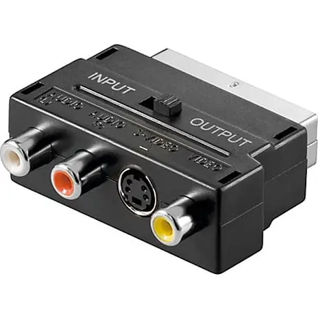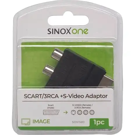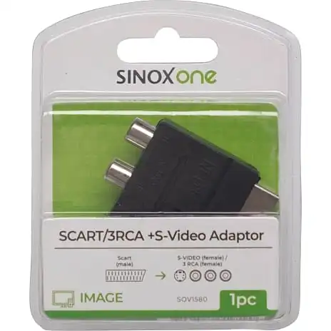 SinoxOneScart til Compositadapter kan bruges til at overføre analoge audio og video signaler.Denne er med omskifter. Der er composit tilslutning på mange projektorer, DVD afspillere og fladskærme. Specifikationer: