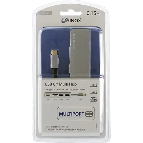 USB-C Han til HDMI, 2 x USB, SD og Micro SD kort læser. Mangler Du indgange til Din MacBook er har en perfekt løsning Du kan have med over alt. Lækker Alu. Finish. Hdmi op til 4K30Hz. RJ45 indgang til LAN. 2 gange USB 3.0: 5Gbps, 5W. SD og TF kort læser.