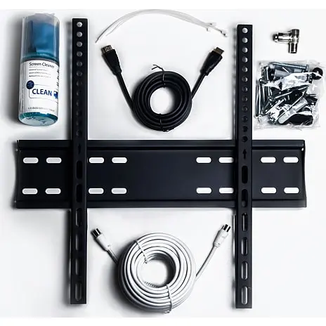 TV-vægbeslag, skærmrens, HDMI kabel, YOUSEE/STOFA godkendt antennekabel med stik og kabelstrips.