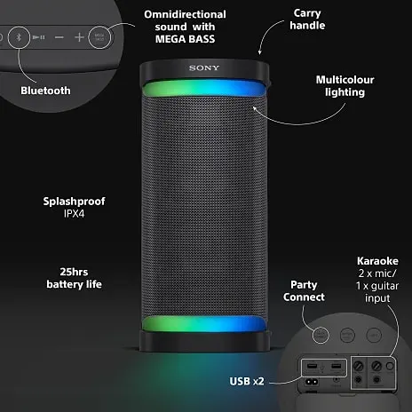 SRS-XP700 har 25 timers batteriliv, hurtig ladning (10 minutter giver 3 timers afspilning) og USB port så du kan oplade din smartphone. Højtaleren har et fleksibelt layout, så du kan stille den både vertikalt eller horisontalt; en sensor optimere lyden i forhold til positioneringen, og den er nem at flytte på, du kan bare tage fat i det praktiske håndtag. SRS-XP700 højtaleren fra Sony er resistent over for vanddråber (IPX4), så regn eller spildte drikkevarer har ingen chance for at ødelægge din fest. Så gør klar til at nyde dine yndlingssange, hvor som helst, hele dagen lang.