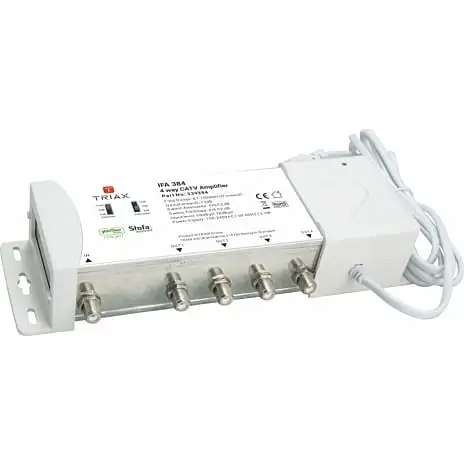 IFA 384, 4-port hus forstærkerEn forstærker med 4 udgange for MATV/SMATV. På trods af forstærkerens effektivitet og gode afskærmning, er TRIAX IFA forstærkerne prisoptimale og hurtig monteret overalt indendørs. De er idelle for forskellige typer af MATV/SMATV løsninger.4 udgange for MATV/SMATVEffektiv afskærmningPrisoptimalHurtig monteret overalt indendørs