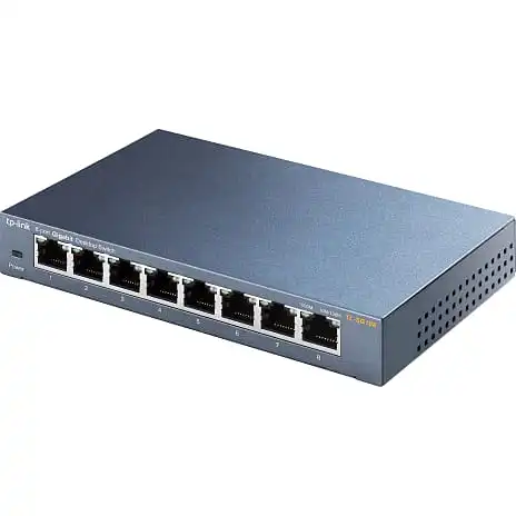 - 8 10/100/1000 Mbps Auto-Negotiation RJ45-porte, der understøtter Auto-MDI/MDIX