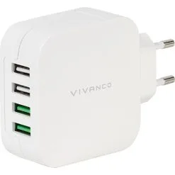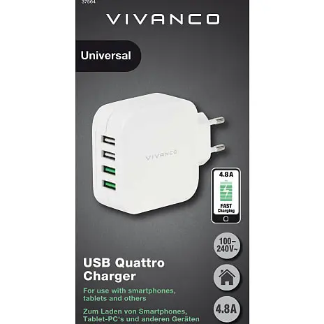 Hjemme-/rejseoplader med 4xUSB, 4,8 A til samtidig opladning af 4 enheder, hvidUSB-universalvægopladeren kan bruges sammen med et hvilket som helst Euro-vægstik med to ben. Opladeren leverer op til 2,4 A fra et enkelt USB-output af hensyn til hurtig opladning af almindelige tablets, smarthones, kameraer m.v. Bedst til rejser takket være fleksibelt inputspændingsområde.Med intelligent IC til identifikation af, hvilken smartphone eller tablet, der oplades (Apple, Samsung, Huawei m.v.)Hurtig opladning med samlet opladningseffekt 4,8 AUSB-output 3 og 4: maks. 2,4 A – 5 V – 10,5 WUSB-output 1 og 2: maks. 1A – 5 V – 5WUniversal – velegnet til alle USB-strømforsynede enheder op til maks. outputeffektInput 110 V/60 Hz + 240 V/50 Hz (til brug over hele verden)EU-stikFarve: hvid