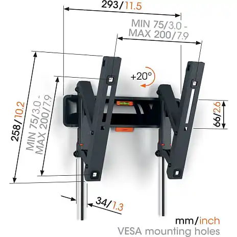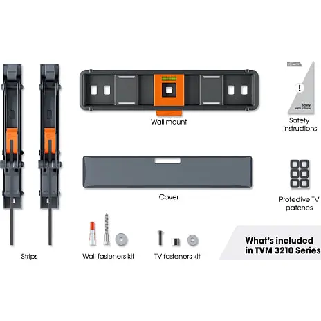 Installationen af COMFORT Tilt vægbeslaget er hurtig og nem. For at hjælpe dig har vi allerede inkluderet en boreskabelon, skruer og Fischer® DuoPower-rawlplugs i pakken. Selve vægbeslaget har et indbygget vaterpas.